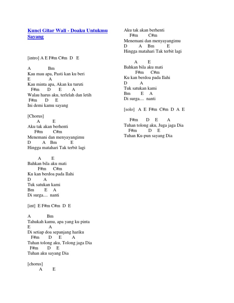 Chord gitar Doaku Untukmu Sayang - Wali Band Intro A E Fm Cm D E. Tuhan Tolong Aku Tolong Jaga Dia DHPRODUCTIONINDONESIA Berikut. Chord Gitar Lagu Hanya Tuhan Saja.